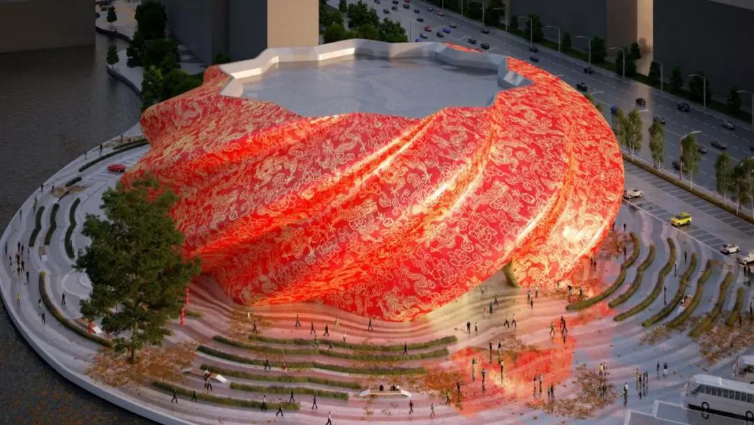 融創(chuàng)茂外立面設(shè)計靈感來源于靈動的絲綢,絲綢造型之間穿插由黃色漸變至紅色的彩釉玻璃,在滿足視覺沖擊力的同時又增加了立面豐富性和流動性。