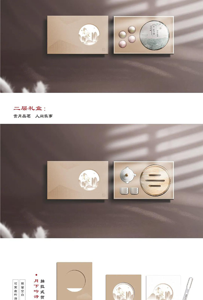 深業(yè)集團中秋禮品定制案例盒包含:精裝可抽拉禮盒吟詩套裝(賀卡+熒光筆)食果套裝(茶果*4)品茗套裝(茶壺+茶杯*2+茶盤)獻禮手提袋