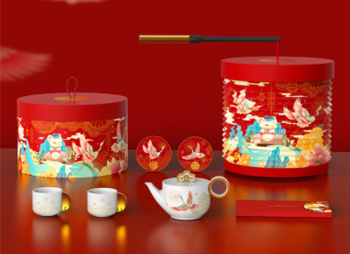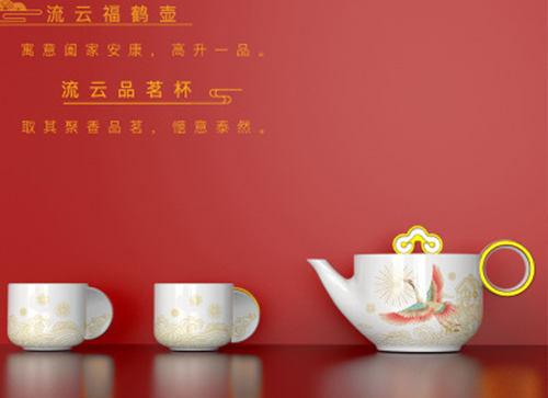瑞鼠送福陶瓷茶具年禮套裝依據(jù)2020鼠年IP形象,敘述了瑞鼠送五福的故事場(chǎng)景,我們將具有吉祥寓意的傳統(tǒng)元素,財(cái)神、仙鶴,南山,荷花,葫蘆,分別設(shè)計(jì)為團(tuán)圓、健康、平安、富貴、福壽五大主題